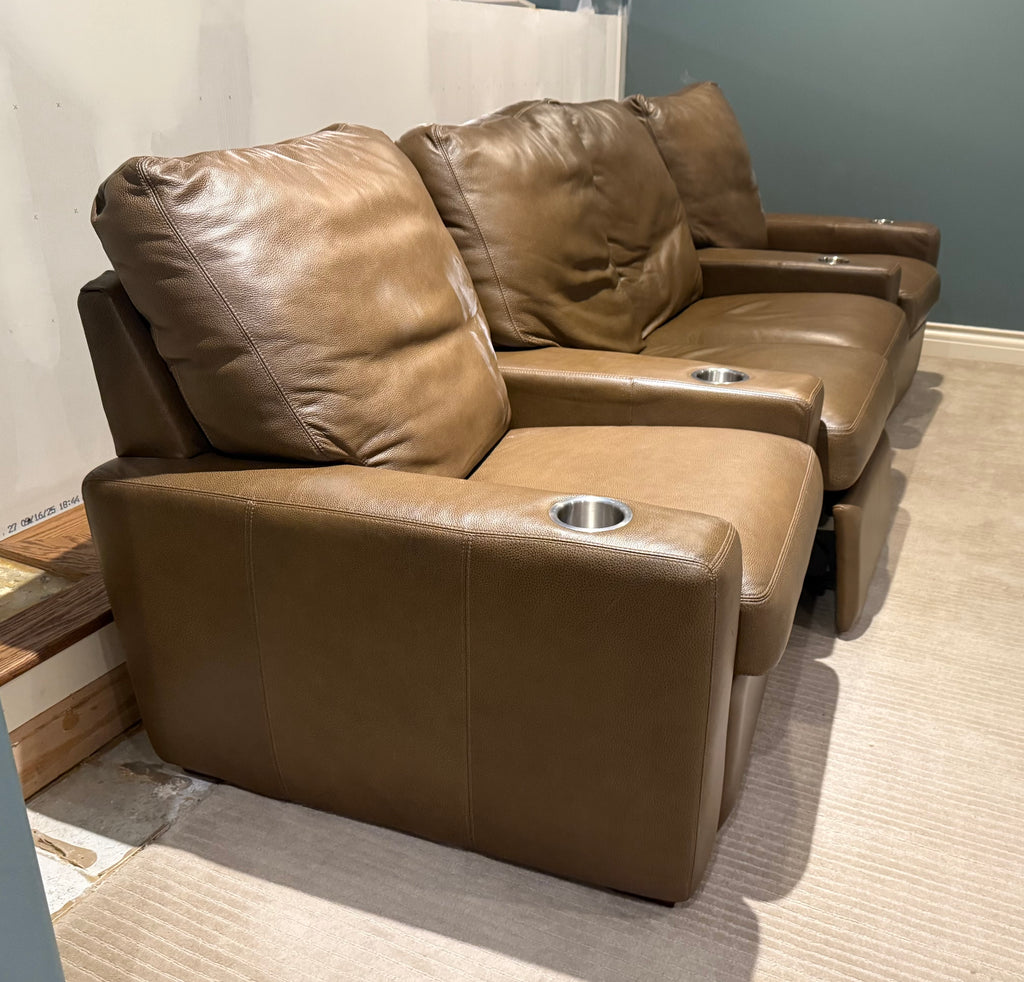 Experience ultimate comfort and sophistication with this American Leather Holden 3-piece power recliner theater seating set. Upholstered in luxurious Vista Juniper leather, this modular configuration features two end recliners (32"w x 43"h x 39"d each) and a spacious armless center piece (64"w x 43"h x 39"d) with integrated cup holders for convenient beverage placement. Every section reclines at the touch of a button, transforming your entertainment space into a personal luxury retreat. Perfect for movie nights, game days, or simply unwinding in style and elegance.