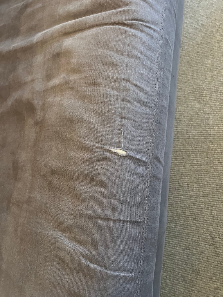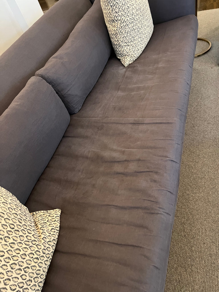 Elevate your living space with this sophisticated Cisco Stewart gray sofa, available as a pair. Each piece measures a generous 84" wide by 34" deep by 31" high, with a comfortable 20" seat height perfect for lounging. While these sofas show signs of character—including minor stains and a small tear on one—they present an excellent opportunity for customization through professional recovery. Ideal for design-savvy buyers seeking quality pieces at consignment value, these statement sofas can be transformed into showstoppers with upholstery refresh.