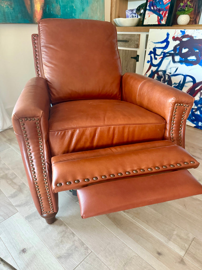 - Premium Top-Grain Leather & Modern Nailhead Accent:Handcrafted with genuine leather upholstery and vegan leather blend; Smooth finish resists stains and scratches; Classic nailhead trim outlines armrests and footrest for timeless elegance