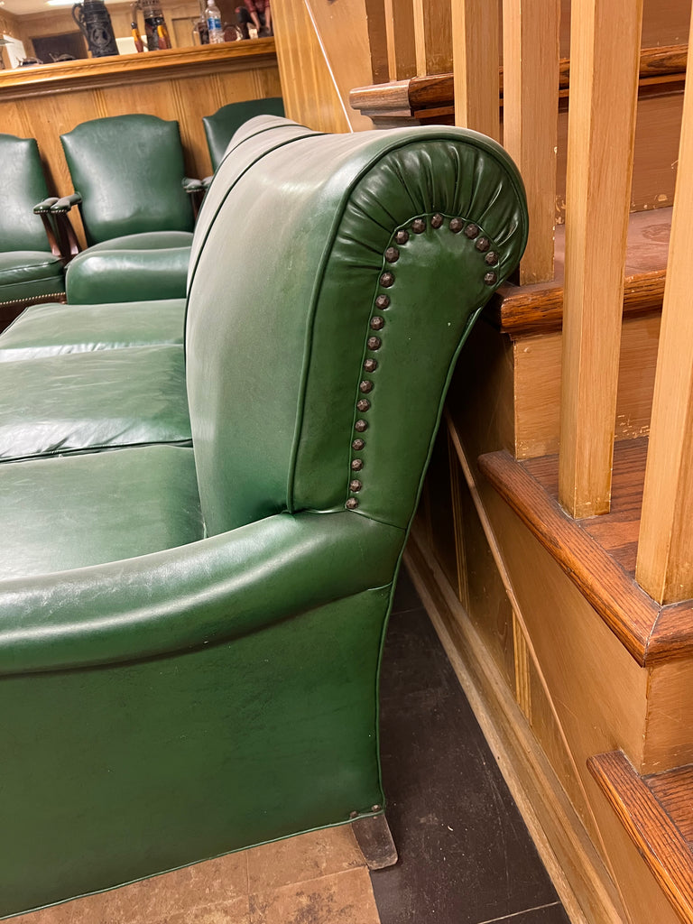 This classic green leather sofa brings timeless sophistication to any living space. Measuring 75 inches wide by 33 inches deep and 34 inches high, it offers generous seating with authentic vintage character. The rich leather patina develops naturally over time, adding to its distinctive appeal. Complementary green leather chairs are available to complete a coordinated seating arrangement.