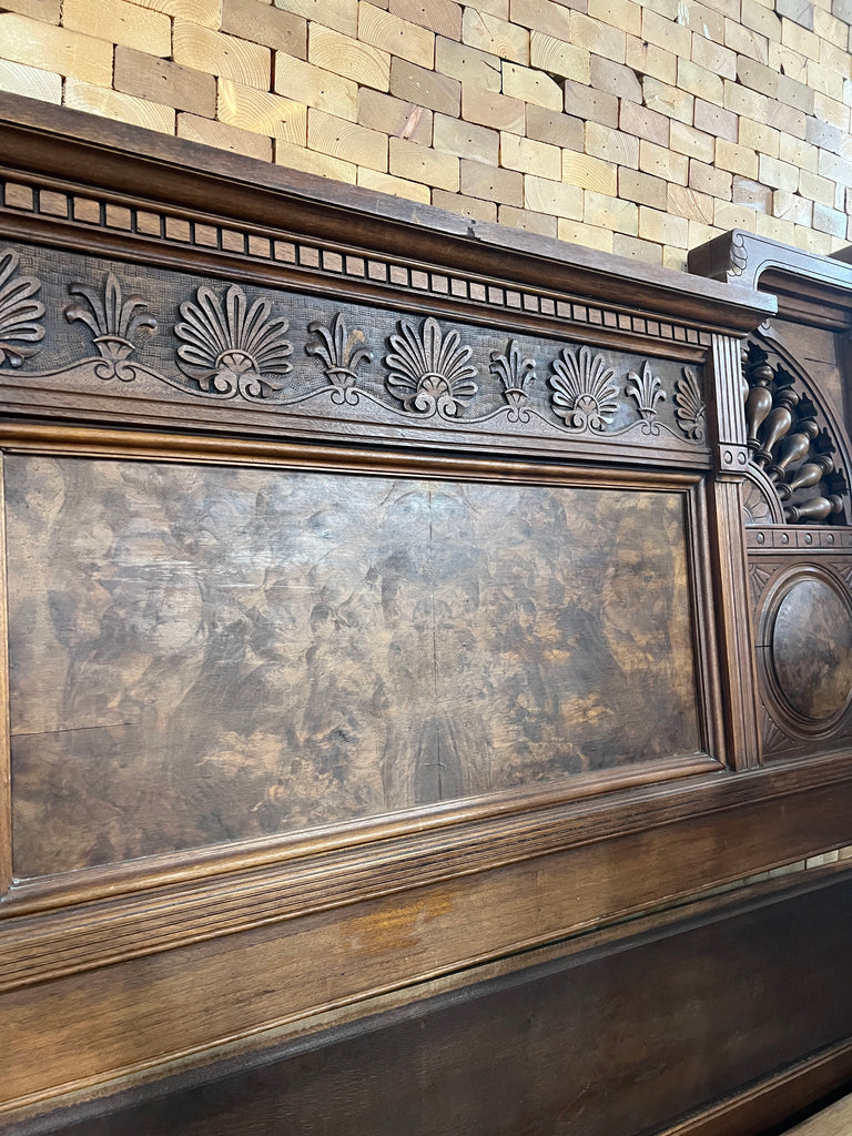 This stunning Victorian Eastlake bed showcases the craftsmanship of a bygone era with its impressive high back design and rich walnut construction. The commanding 76-inch headboard makes a dramatic statement in any bedroom, while the proportionate 35-inch footboard maintains elegant balance. Measuring a full 60 inches wide, this antique piece combines authentic period styling with functional bedroom furniture. Perfect for collectors and those seeking distinctive vintage character, this walnut bed transforms your sleeping space into a showcase of timeless sophistication and architectural detail.