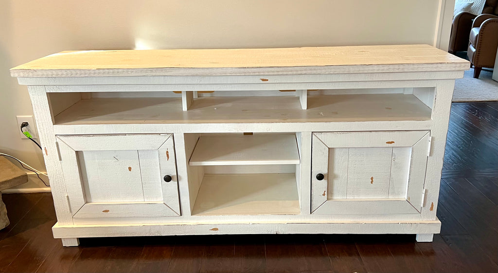 Elevate your living room with this stunning 64-inch white distressed console, expertly crafted to blend timeless charm with modern functionality. Measuring 17 inches deep and 30 inches tall, it offers the perfect balance of style and practicality for displaying your television and cherished décor. The distressed finish adds character and warmth to any space, creating an inviting focal point that complements both contemporary and traditional interiors. A versatile piece that transforms your entertainment area into a sophisticated retreat.