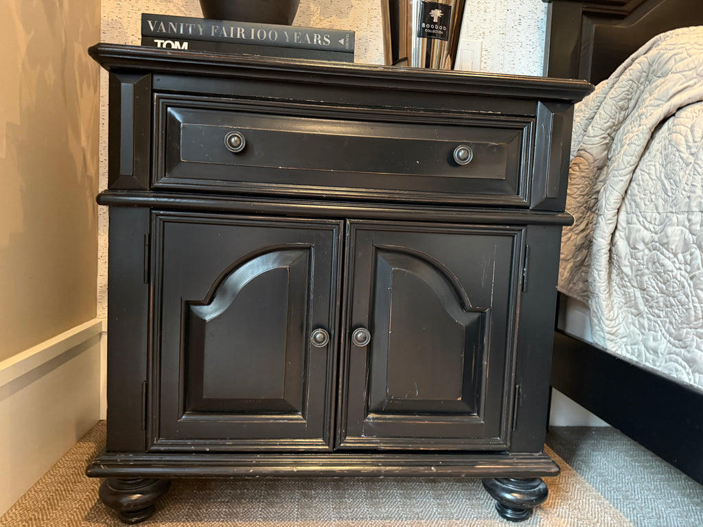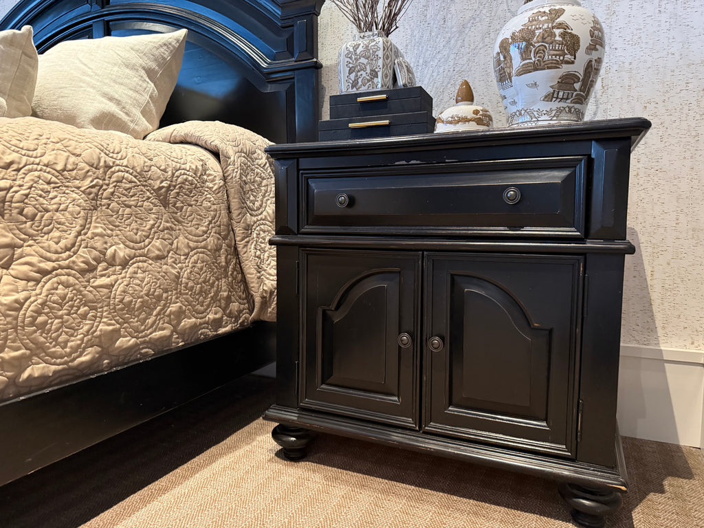 Complete your bedroom with this elegant King Black Three Piece set, featuring a sturdy bed frame, supportive mattress set, and matching pair of nightstands. Perfect for creating a cohesive, sophisticated sleeping space. This consignment piece shows minimal wear with only small cosmetic chips, making it an excellent value for quality bedroom furniture. Ideal for those seeking luxury furnishings at accessible prices.