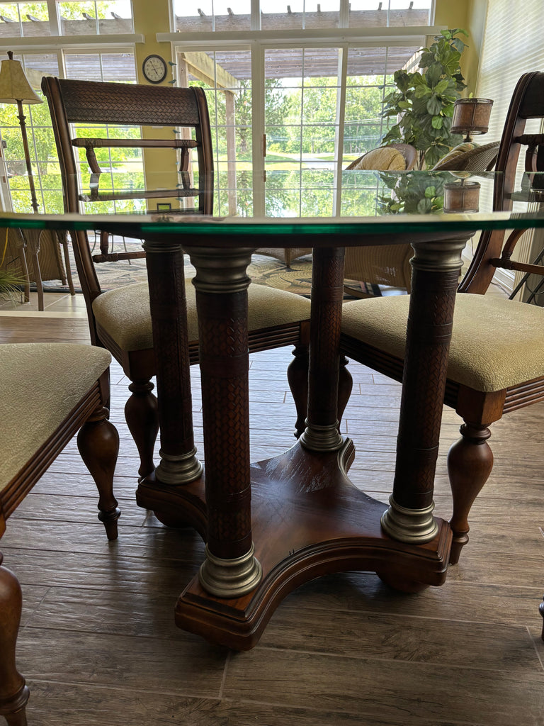 The Serengeti Kuli Wood Round Pedestal 50" Dining Set from Ashley Furniture is a sophisticated and expertly crafted addition to any dining space. With its solid wood construction and elegant pedestal design, this set exudes both style and durability. Elevate your dining experience with this exquisite set from Ashley Furniture. Includes pedestal table with beveled glass top and 4 dining chairs.