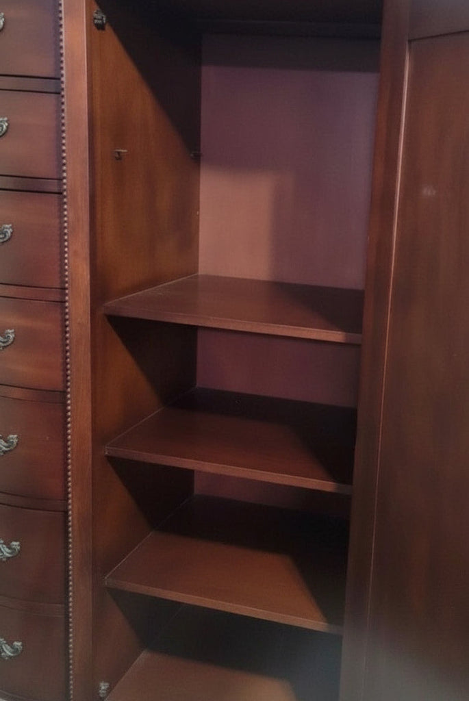 This substantial wooden armoire brings timeless elegance and practical storage to any bedroom. Standing at an impressive 66 inches tall with a generous 65-inch width and 18-inch depth, it offers ample space for organizing your complete wardrobe. Crafted from solid wood, this piece combines durability with sophisticated style, serving as both a functional storage solution and a striking focal point. Perfect for those seeking quality furniture that withstands the test of time while elevating your bedroom's aesthetic appeal.