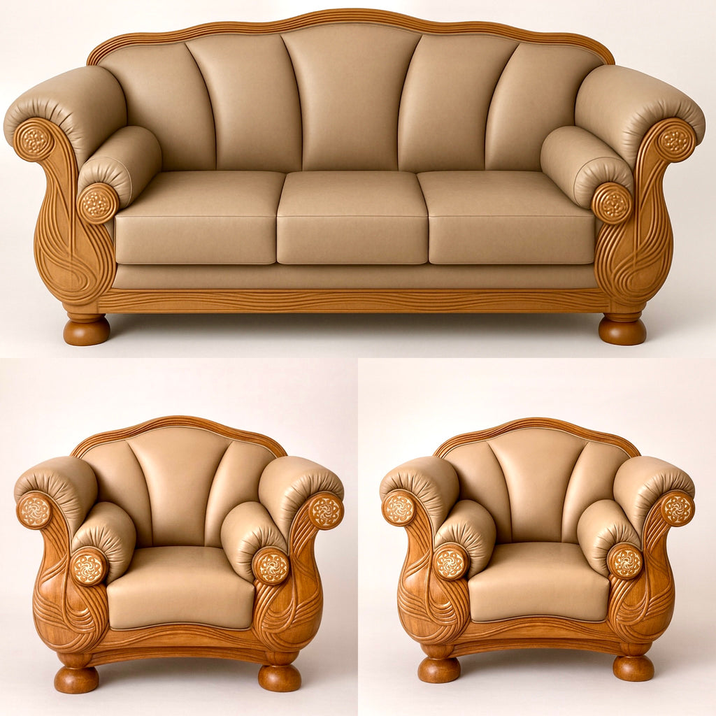 Teak, Leather and Mother of Pearl Sofa and Pair of Chairs Made in Thailand