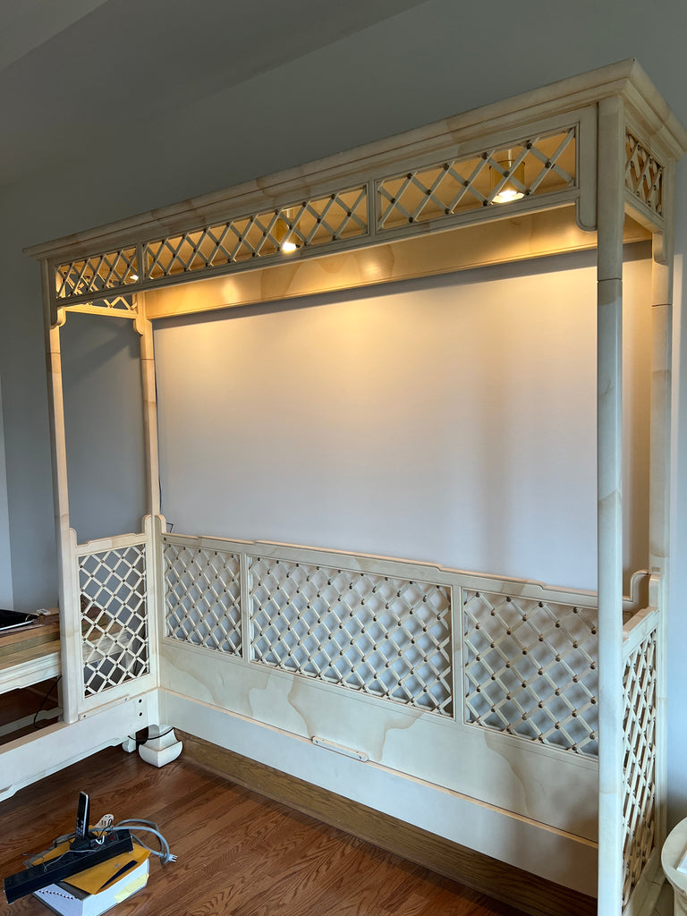 Transform your bedroom into a luxurious retreat with our Vintage MCM Henredon King Canopy Bed. The lacquered faux goatskin is both soft and durable, while the Ming leg design adds a touch of elegance. The built-in lighting creates a cozy ambiance for a truly indulgent sleeping experience.