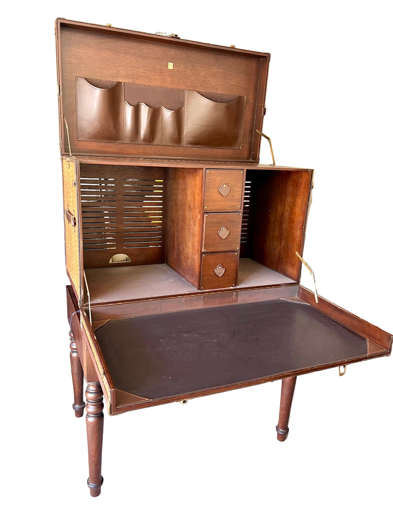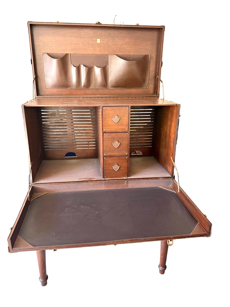 Expertly crafted and one-of-a-kind travel desk. This space-saving 2-piece set is ideal for small spaces. Dimensions are 38”x23”x54”h, designed by Stiles Brothers for Bauer.